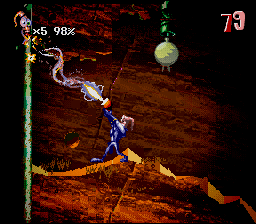 Jim's Electro-Gun, exclusive to this level, yet permanent and non-swappable. (Super Nintendo version of Earthworm Jim 2)